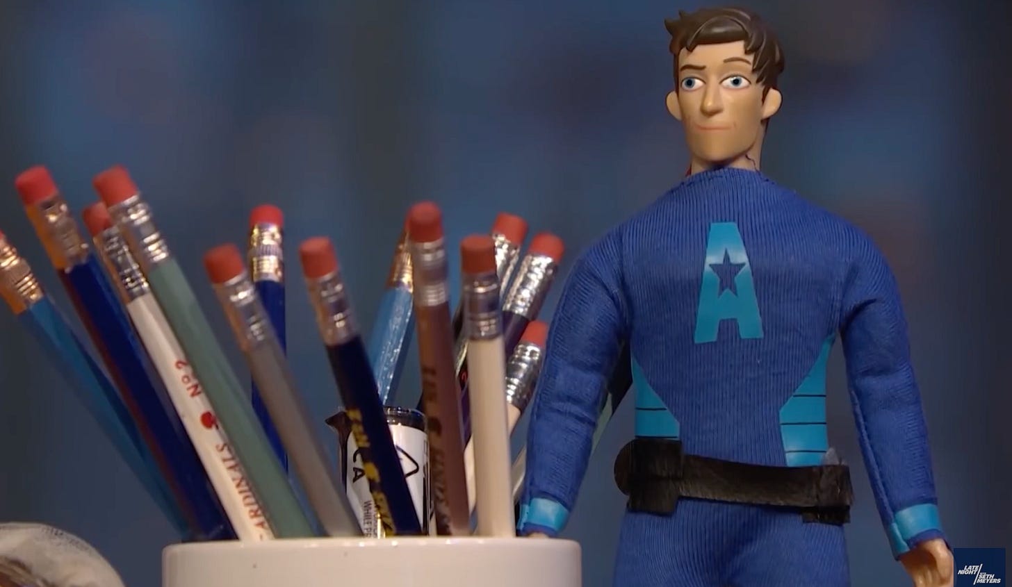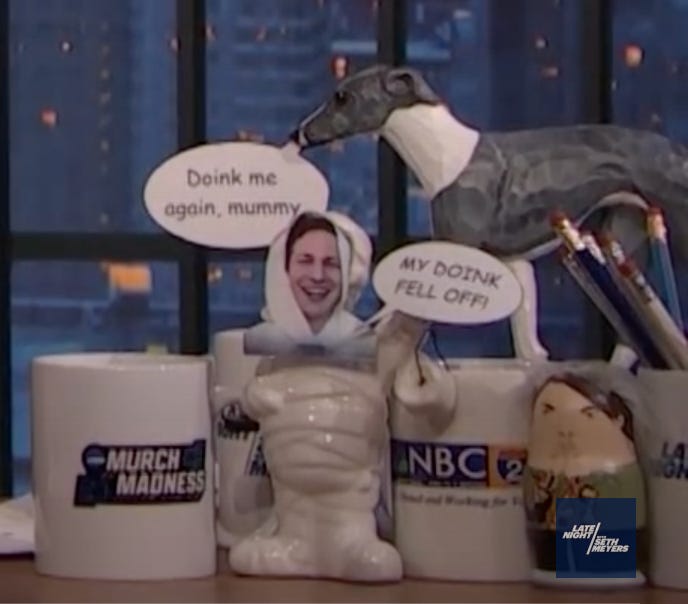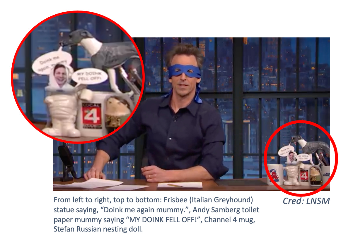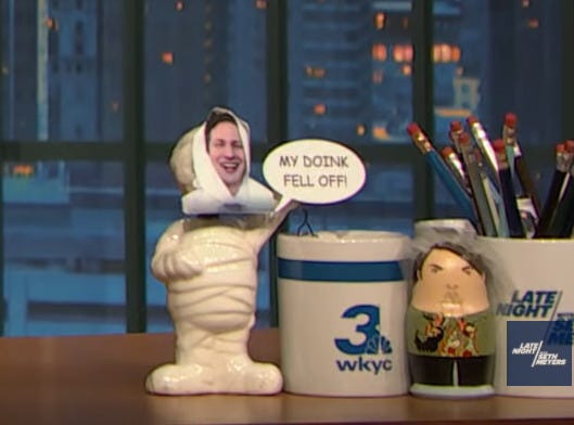 Prock Doll: Last up on Seth’s increasingly niche collection of sketch action figures(?) is an actual action figure from his Hulu show, The Awesomes (2013-2015). His kids have been featured wearing costumes inspired by his animated adult show, and the action figure of his character, Prock, rounds out the Late Night desk (not center couch material apparently). Created with his trusty EP, Mikey the Shoe, The Awesomes features all your SNL favorites (voice acting) and then some. Unfortunately I did not find when the doll made his late night debut. However, readers might remember that Prock got to speak following the chapter of inanimate objects coming to life known as the Captain’s Quarters.