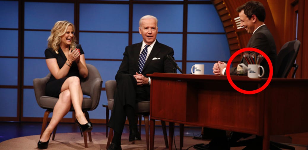 Seth’s desk landscape is not only a part of the show, but an integral part of Corrections, as it houses mugs featuring references to the best and worst of Jackal culture. Although viewers have been treated to talking desk elements since the first days of The Crew Era (Phase 3), the LNSM desk has evolved into an extension of Meyers himself…allowing our trusty host to dabble in prop-comedy, keep his ever changing notes organized, and test the limits of his Jackals’ twentieth-century pop-culture literacy.