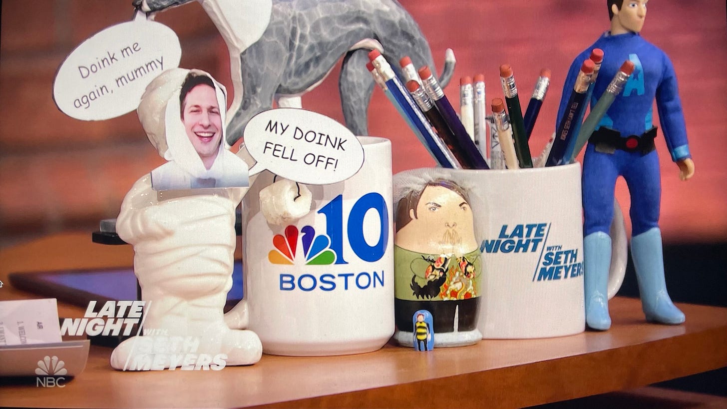 ANOTHER Mug: Stefon has been there since day one. As has Seth, and a Late Night with Seth Meyers logo mug. Another constant? Every show features a mug from a different NBC affiliate station. And trust me, they. love. it. (btw those are six separate links to local news stations really excited to be featured on the late night desk). There are even (old) Tumblr pages dedicated to tracking the mugs. Here is Seth talking about the now eight-year long tradition.